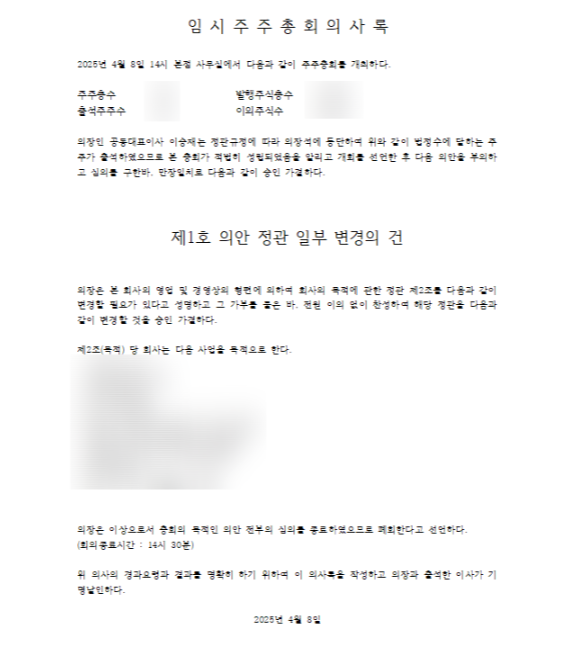 이걸 바꾸는 건 회사의 헌법을 바꾸는 일과 같기 때문에, 공증을 통해 법적 효력을 확보해야 해요.