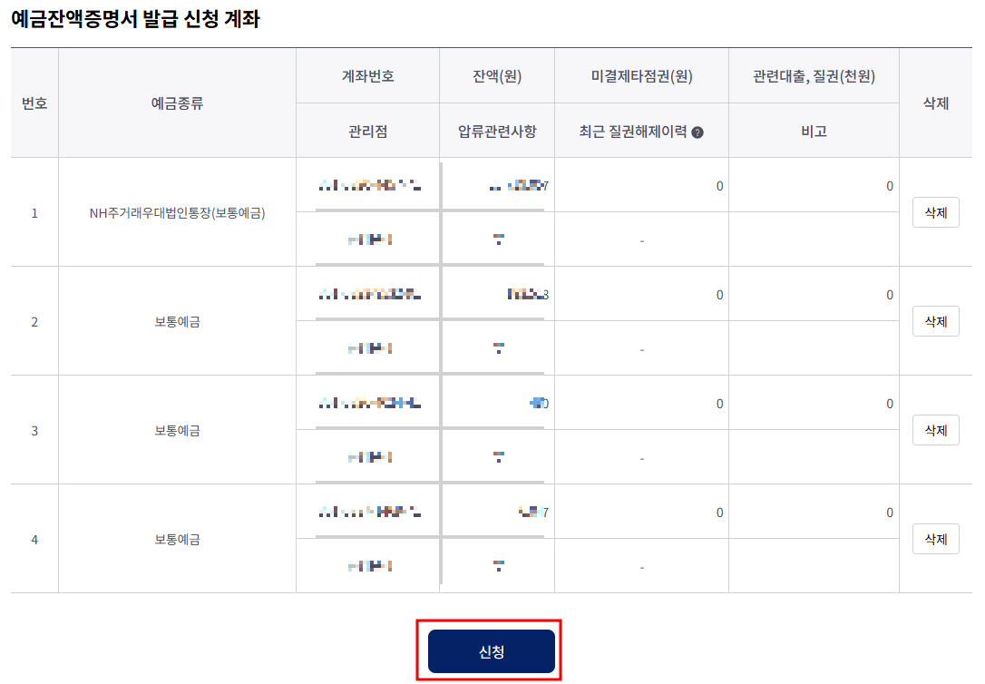 예금잔액증명서 발급 신청 계좌를 확인해 주세요.